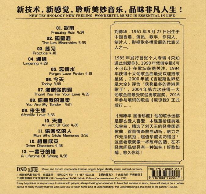 本碟重拾经典难忘金曲,精选了刘天王的经典国语歌曲,首首情牵曲曲动听,魅力之作无法抗拒,超值珍藏。