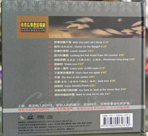 王雯,柔美怡人的声线,宛如人间的精灵,清新纯美。空间感营造恰到好处,乐器音色润泽面鲜明,人声清澈透明,她那情深款款的演唱,令人如痴如醉。