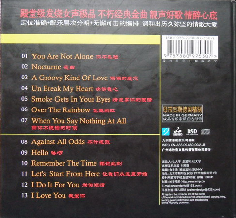 聆听这张由金池演绎的全英文 LOVE SONG,久违的女声,天赋一把略带金属质感的金嗓子,更趋成熟完美,她的歌声更具浓烈韵味,表情的舒展更觉丰盛。歌唱,配器配合的天衣无缝,不但是技术过人,那动人的气味更是令听者拍案叫绝。录音音效格外清晰,人声的分离度立体声非常标致玲珑,整个音色属少许偏厚特性,所以听来无论是乐器或人声都特别有到‘肉’的感觉。让人意犹未尽,令你听出耳油。