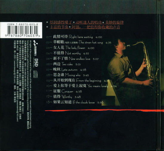 阿强的声音,是那种非常有味道的、磁性的、成熟的声音,不加点缀雕琢夸张和煽情,也没有诡谲奇异。但是他的声音绝不是平板苍白,他的歌声河流里生活的内质沉静丰富蕴藉,那种情感深处的波澜不露声色却汹涌激荡。这样的歌唱已难用圆润厚重来简单地评说。我能做的,就是坐下来倾听,让我的心随着阿强的慢歌散步。窗外的夜色已晚,我在阿强的音乐湖泊里寻找自己的不曾有的浪漫或者有过的故事。