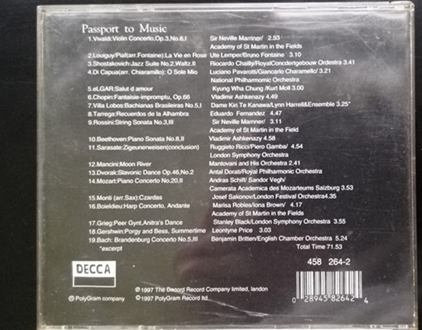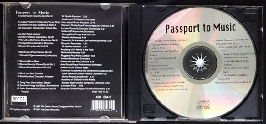 《音乐护照》不是真正的护照,而是由DECCA 公司在1997年出版的一张精选唱片。唱片内收集了来自十多个不同国家的作曲家的作品,包括贝多芬、德沃夏克、罗西尼、莫扎特、巴赫、格什温等,你可以在短短的80分钟里领略到最出色的音乐精品,更可以细细比较不同音乐家音乐的差异。
